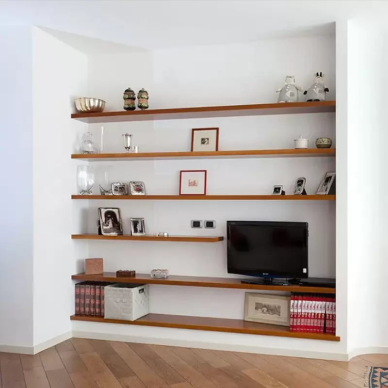 Descrizione Soluzione per soggiorno con mensoloni su misura in legno massello. Dettagli Materiale: legno massello Dimensioni: soluzione su misura